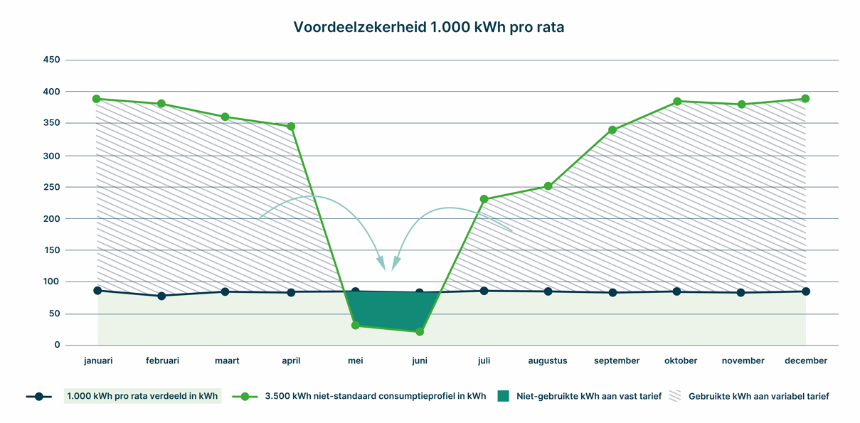 Kortom: jouw verbruik volgt de groene lijn. Daardoor benut je vanzelf elk deel van de 1.000 kWh aan vaste prijs, en is een rebate voor jou niet van toepassing.